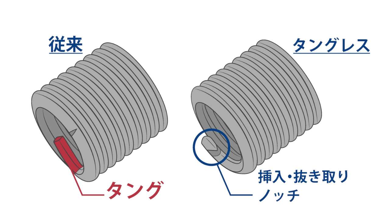 専用の工具を使うことで、インサートからタングをなくすことに成功。従来のタング付きインサートでは手間のかかった各種作業(工程)から開放され、作業効率が大幅にアップします。
